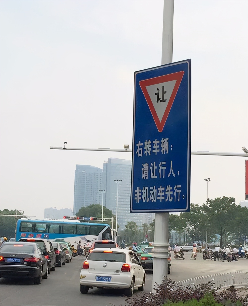 车辆右转时一定要避让行人,待行人通过后再右转。
