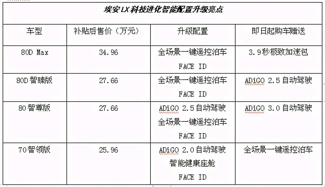 更聪明的泊车系统、更先进的自动驾驶系统、更前卫的座舱科技,正在让人们的出行更加轻松、便捷。而本次埃安科技进化发布的最大亮点之一,正是智能层面的进化。在原有产品高科技产品力的基础上,埃安LX科技进化各配置车型将全面升级最高规格的ADiGO自动驾驶系统,并增配全球唯一全场景一键遥控泊车,让全球最顶级的智能科技触手可及。以埃安LX主力车型80智尊版为例,其不仅新增了ADiGO 2.5自动驾驶系统和一键遥控泊车,即日起购车还可升级ADiGO 3.0自动驾驶套装。