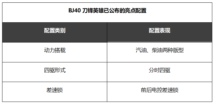 再如,为了达到长续航大扭矩的动力,刀锋英雄甚至还推出了柴油版本,搭载2.0D+8AT的动力总成,续航里程和驾驶平顺性或将成为该车最大的亮点;而应付沙漠里对胎压的实时掌握,刀锋英雄甚至连备胎都配备了TPMS,当然分时四驱配合前后电控锁实现的"三把锁"的优势在刀锋英雄身上必然也是标配……很显然,BJ40刀锋英雄,无论从命名还是产品表现来看,它就是一款以专业赛事理念标准打造的专业越野车,其身上到底还有多少达喀尔赛场的技术元素,相信也会在赛事凯旋之日公布于众!