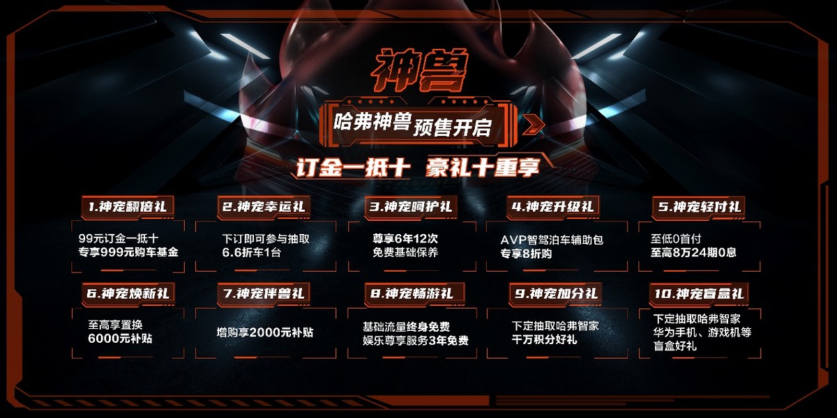 除了惊喜十足的预售价格,哈弗神兽还为驯兽师们送上诚意满满的十重“硬核礼遇”。在预售期间,用户仅需99元订金即可专享999元购车基金,而且哈弗神兽还将在预售下订用户中抽取一位专享6.6折购车好礼的幸运用户。 预售下定用户还可享8折选装AVP智驾泊车辅助包、6年12次免费基础保养、基础流量终身免费、3年娱乐尊享服务免费等好礼。金融政策方面,哈弗神兽还推出至低0首付、至高8万24期0息等神宠轻付礼,老车主预售下定还可享受至高6000元置换补贴,增购可享2000元补贴。