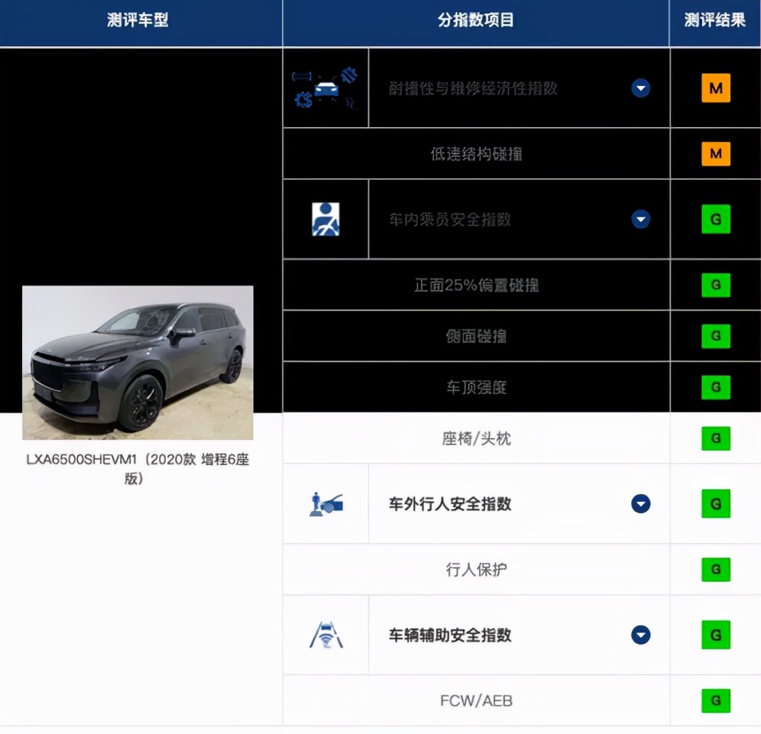 参与碰撞测试的是理想ONE 2020款 增程6座版,除了耐撞性与维修经济性指数这一项获得了M(一般)评价外,其他项目均获得了G(优秀)评价。正面25%偏置碰撞项目当中,理想ONE的A柱出现轻微变形,气囊以及侧气帘均正常工作,不过约束系统表现较差,侧面头部安全气囊打开后的覆盖范围有限,安全带对假人约束力有限,导致前倾过度,最终约束系统与假人运动项目获得了A(良好)评级。另外,在侧面碰撞中,碰撞后B柱与驾驶员座椅中线之间的距离为25.5厘米,评级为G(优秀)。