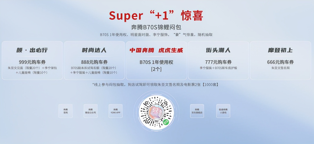 一汽奔腾还采用时下年轻消费者所钟爱的“拆盲盒”形式,为购车用户带来Super“+1”惊喜。用户通过“闷包星球”小程序,参与闷包抽取,到店试驾即可领取明星朱亚文签名照以及电影票2张(1000套)。同时,“奔腾B70S锦鲤闷包”分为“中国奔腾 虎虎生威”、“颜·出必行”、“时尚达人”、“街头潮人”以及“摩登初上”五大主题,包含奔腾B70S 一年使用权、李宁球包和服装、儿童安全座椅,更有666元-999元超值购车券、奔腾B70S剧本杀试驾名额、奔腾B70S新车底护板等“豪”气惊喜,订车用户随机抽取其一,可喜提更多福利,一汽奔腾实力宠粉在行动!