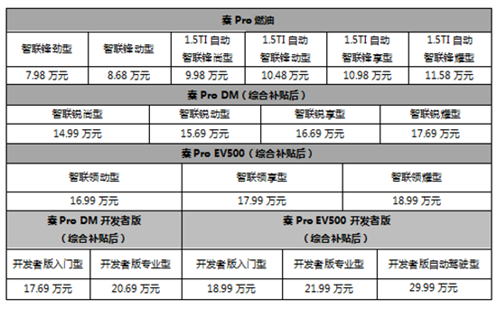 “中国最美中级轿车”秦Pro燃油版,搭载1.5L自然吸气发动机和1.5TI涡轮增压发动机,经济、平顺、稳健;秦Pro DM采用全面进化的第三代DM技术,百公里加速时间仅为5.9秒,综合工况下纯电续航可达80公里,综合百公里油耗低至1L,堪称“最强插混中级轿车”;得益于高能量密度的大容量电池,匹配最新电池智能温控管理系统,秦Pro EV500纯电里程高达500公里,30分钟可充电至80%,单日最长行驶里程可超过800公里,彰显“专业级纯电中级轿车标杆”身份。