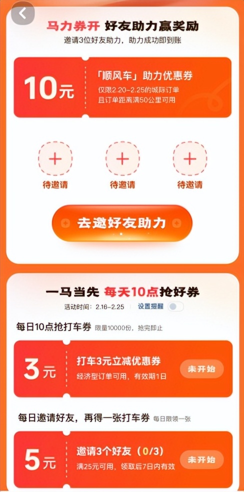 乘客的福利同样丰厚。活动期间,每日都会上线无门槛打车券抢购活动,1万份打车券先到先得,乘客登录活动页面就能参与。