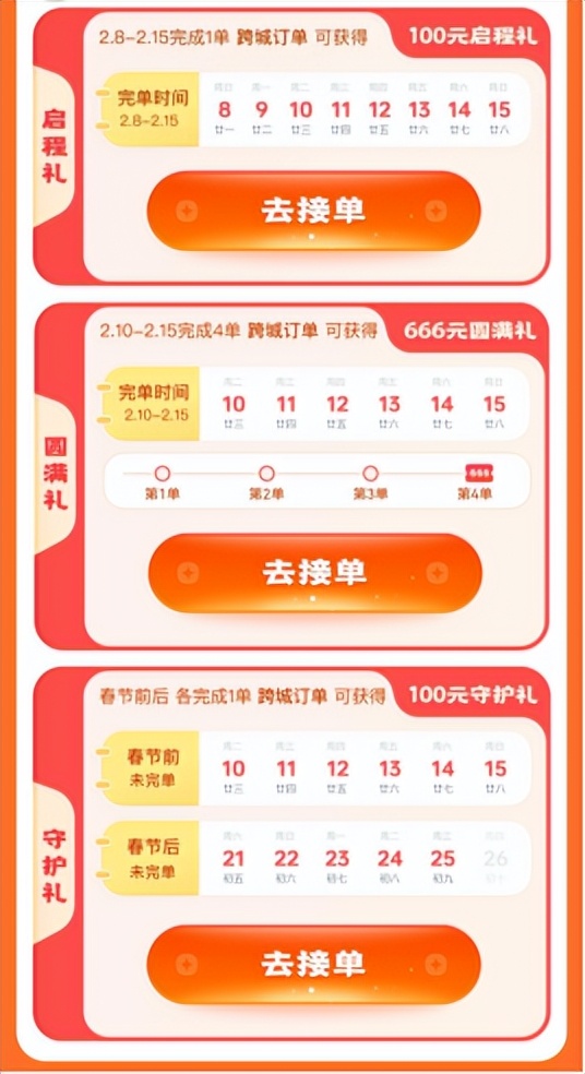 其中,666元圆满礼内含33张接单现金券,单张最高返现50元,启程礼、圆满礼和守护礼中还包含市内及跨城接单奖励券。