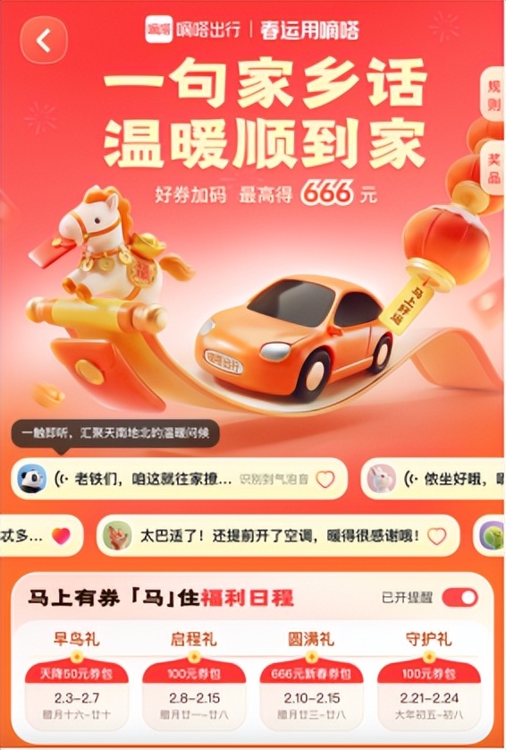 近日,嘀嗒出行正式上线“一句家乡话,温暖顺到家”2026春运主题行动,面向乘客和车主推出多重大额券福利及特色活动,既帮大家省钱,也让返乡路途更有温度。