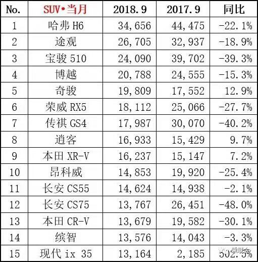 9月份SUV中日系车绝对是最大的赢家,有5款车型进入前十五,奇骏、逍客、本田XR-V销量都在上涨。