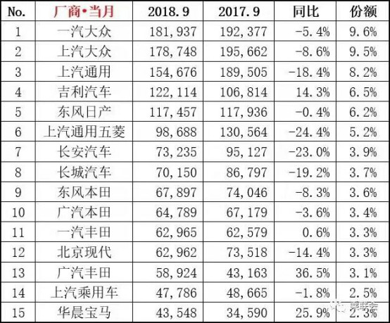 从9月份厂家的销量来看,宝马和丰田增长较多,吉利是唯一增长的自主品牌。