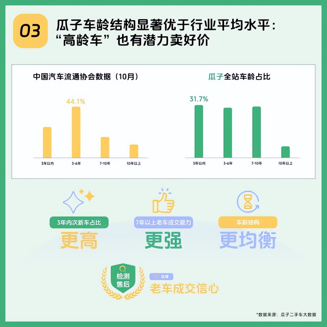 冷门车也能卖出好价钱,打破了“热搜=热销”的固有认知。在瓜子平台上,宝马X7、奥迪TT等豪华小众车型虽然搜索热度高,但因潜在买家分散,在传统线下市场常被压价。而通过C2C模式直连全国个人买家后,这些车型的稀缺性反而成了优势,能精准匹配到愿意支付溢价的买家。数据印证了这一点,无论是3年以内的次新车,还是7年以上的“高龄车”,在瓜子平台都能找到合适的受众,成交占比均高于全国平均水平,这得益于平台严格的检测体系和全国需求匹配能力。