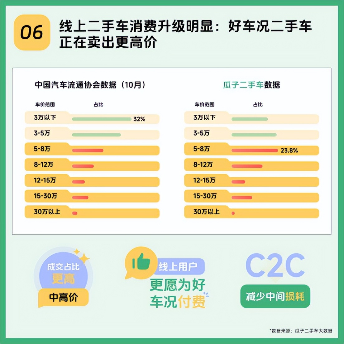 线上二手车消费升级的趋势,也给车况好的车主带来了红利。全国二手车市场中,5万以下低价车型占比近六成,但瓜子平台主流成交集中在5万元以上区间。随着购车人群年轻化,消费者不再只看低价,更看重车况、服务和性价比,也愿意为可靠的交易体验买单。这意味着,车况良好的车辆在平台上,更容易吸引预算充足的精准买家,减少中间环节的价格侵蚀。