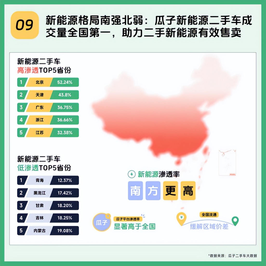 值得注意的是,二手新能源市场呈现“南强北弱”格局,北京、江浙沪、广东等地区渗透率均超30%,北方因气候等因素需求相对有限。凭借全国第一的新能源二手车成交量,瓜子平台能将北方的新能源车辆精准投向南方需求旺盛区域,帮助车主避开区域性低价。